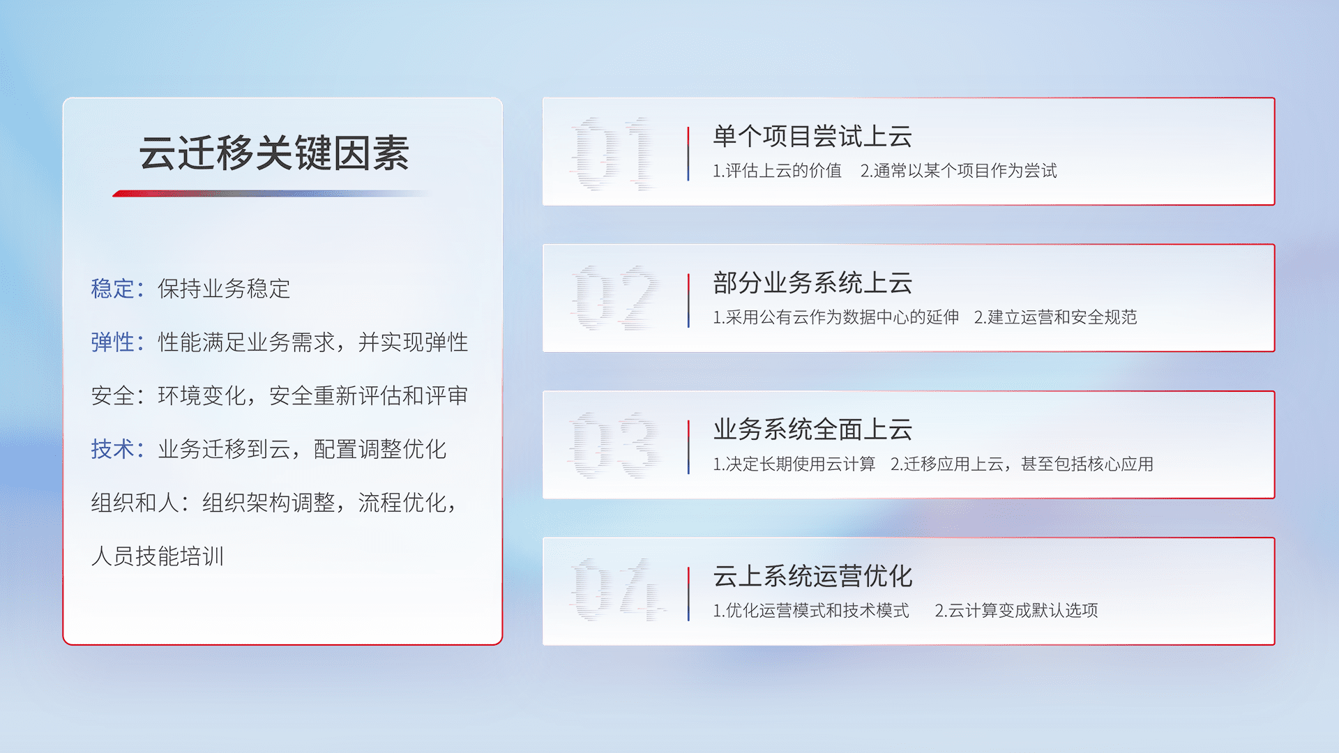 结合实际业务,,,,从规划设计、、云平台选型、、、、云原生改造、、、、数据迁移、、集成交付,,,迁移全过程为客户识别最佳上云路径,,,,做好风险识别管理,,,,设计网络架构、、、身份权限、、、、安全审计合规、、操作审计、、、日志审计、、、、监控告警策略、、、多站点容灾设计等,,,对云上基础设施进行整体规划,,提升IT治理水平,,以满足弹性、、、高可用、、、、高性能的需求。。。。