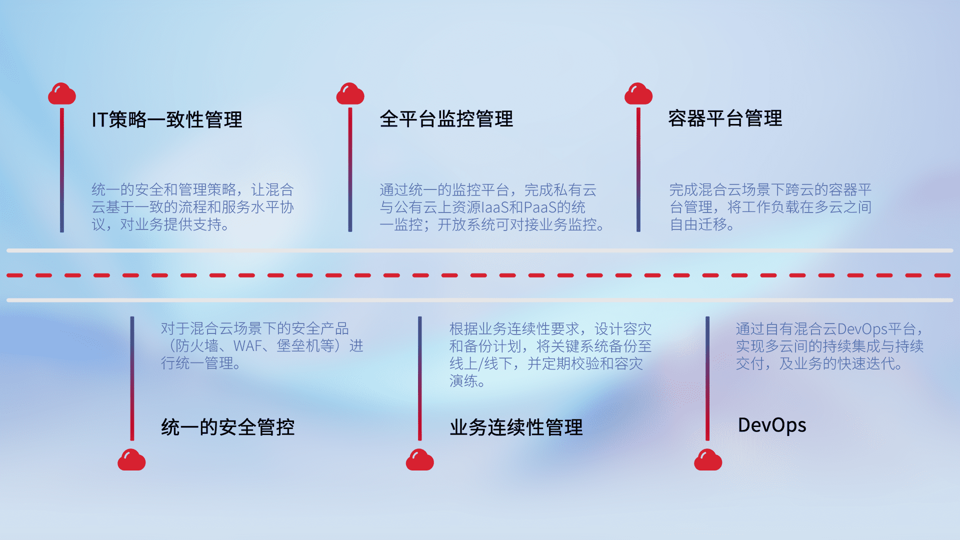 通过多云纳管,,,以统一的资源数据模型把客户的云资源进行抽象和封装,,,进而实现对多云资源的统一操作,,,保障云资源管理的可靠性、、、稳定性与可用性。。。量身定制化运维内容,,配置、、、、开发运维、、、补丁管理、、、备份、、监控、、认证和访问管理、、、审计和日常巡检等,,保障在用云过程中的可靠度,,稳定度以及高可用率。。