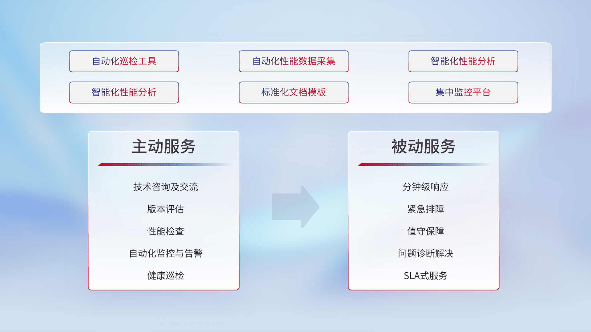 智能化工具和标准化文档,,,,保障服务质量,,,,提供主动服务(包含技术咨询、、、版本评估、、、性能检查、、、、自动化监控与告警、、、健康巡检)和被动服务包含(分钟级响应、、紧急排障、、、、值守保障、、、问题诊断解决、、SLA服务)。。。